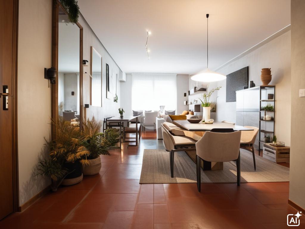 L'ingresso apre verso il soggiorno di dimensione generosa che è caratterizzato dalla presenza di un camino a legna che fa da sfondo alla stanza. L'ambiente è in grado di accogliere sia il salotto che la sala da pranzo, la portafinestra conduce allo spazioso terrazzo con vista verso le colline.