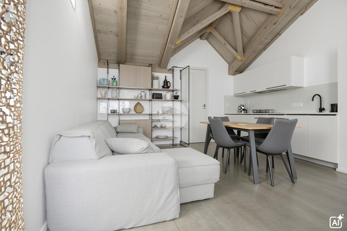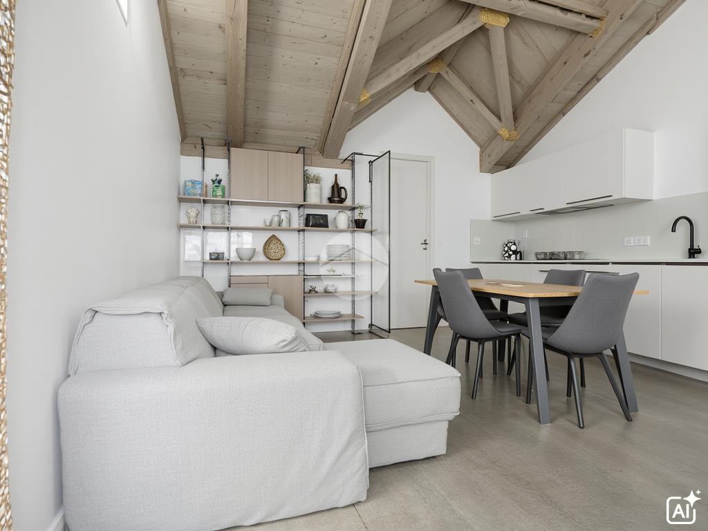 L'ingresso è sulla zona giorno unica in cui è presente una comoda parete cottura lineare da sfondo al soggiorno. La portafinestra conduce al primo balcone.