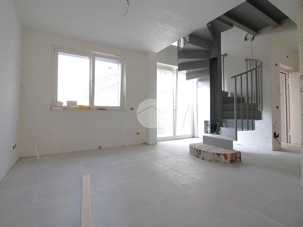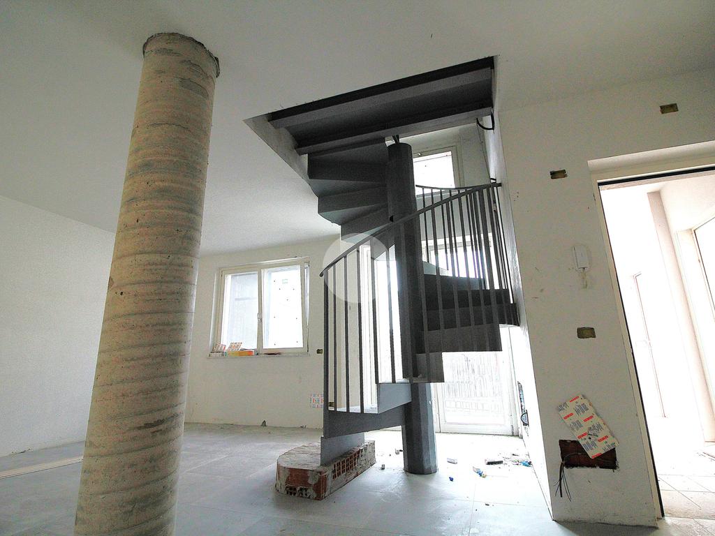 Il portoncino d'ingresso blindato apre sulla zona giorno unica sviluppata sull'intero primo piano.