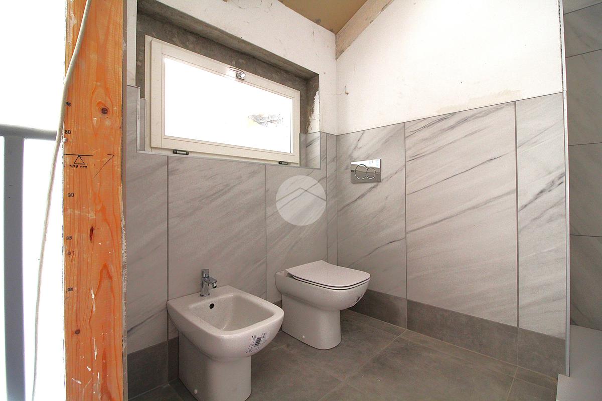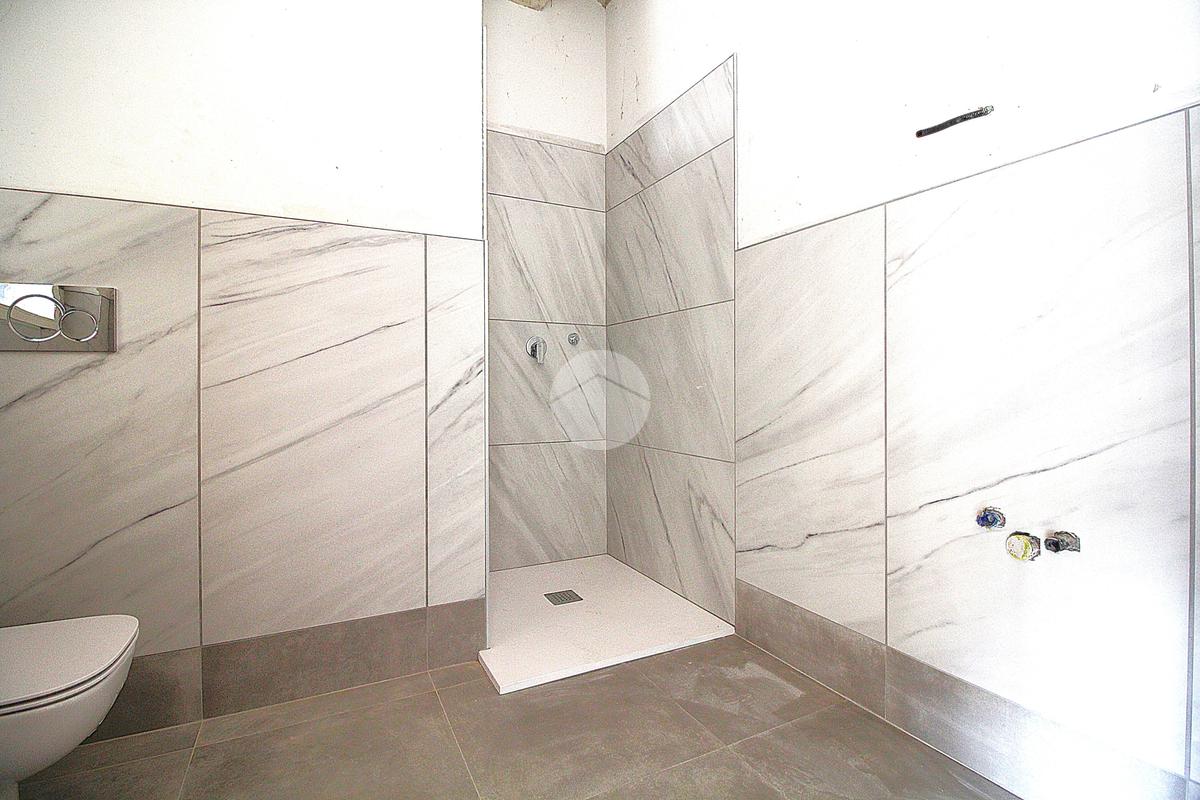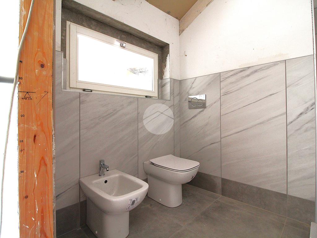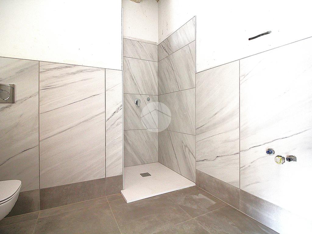 Il bagno è rivestito con piastrelle in gres porcellanato effetto marmo, ed è dotato di sanitari moderni filo muro e ampia doccia. Nell'antibagno è presente l'impianto di carico per la lavatrice.