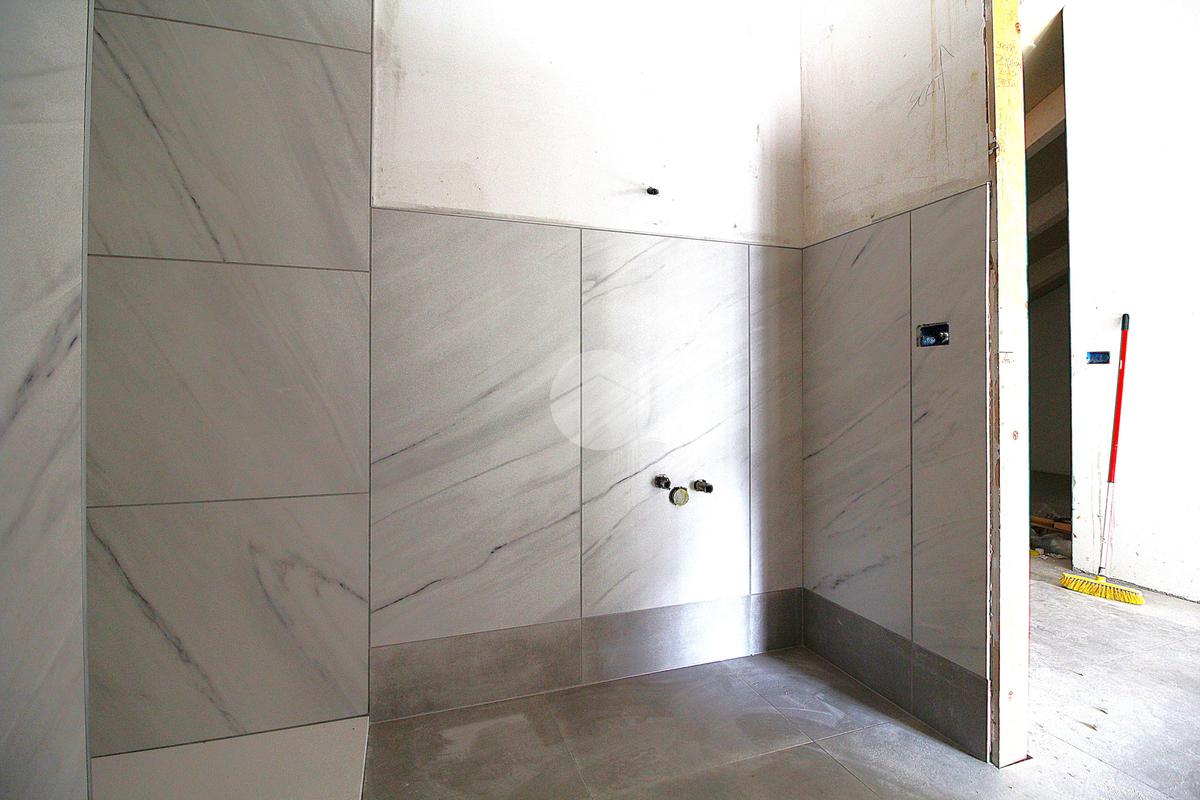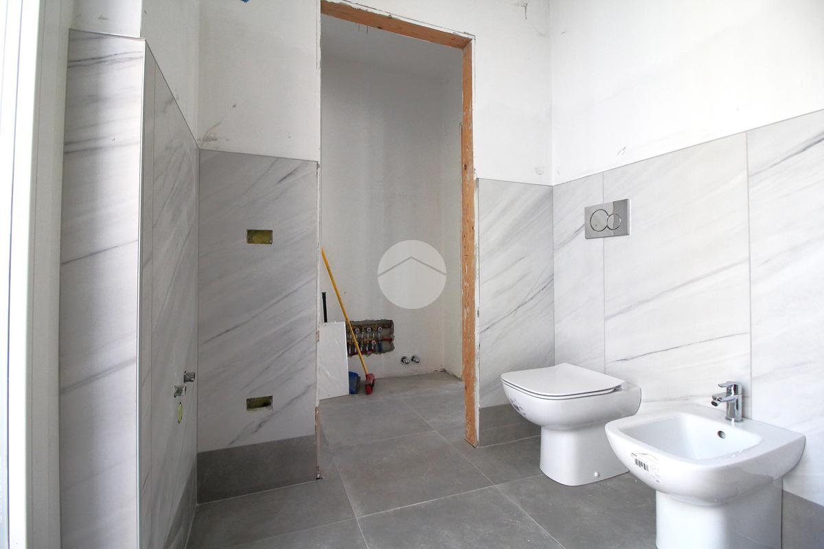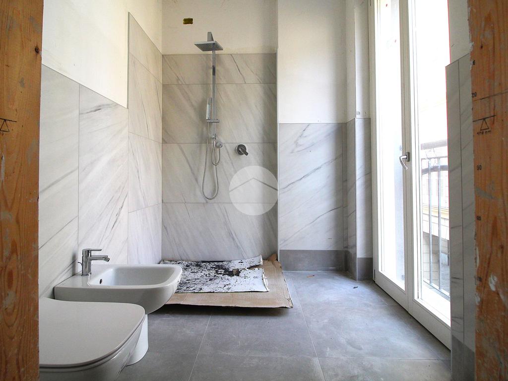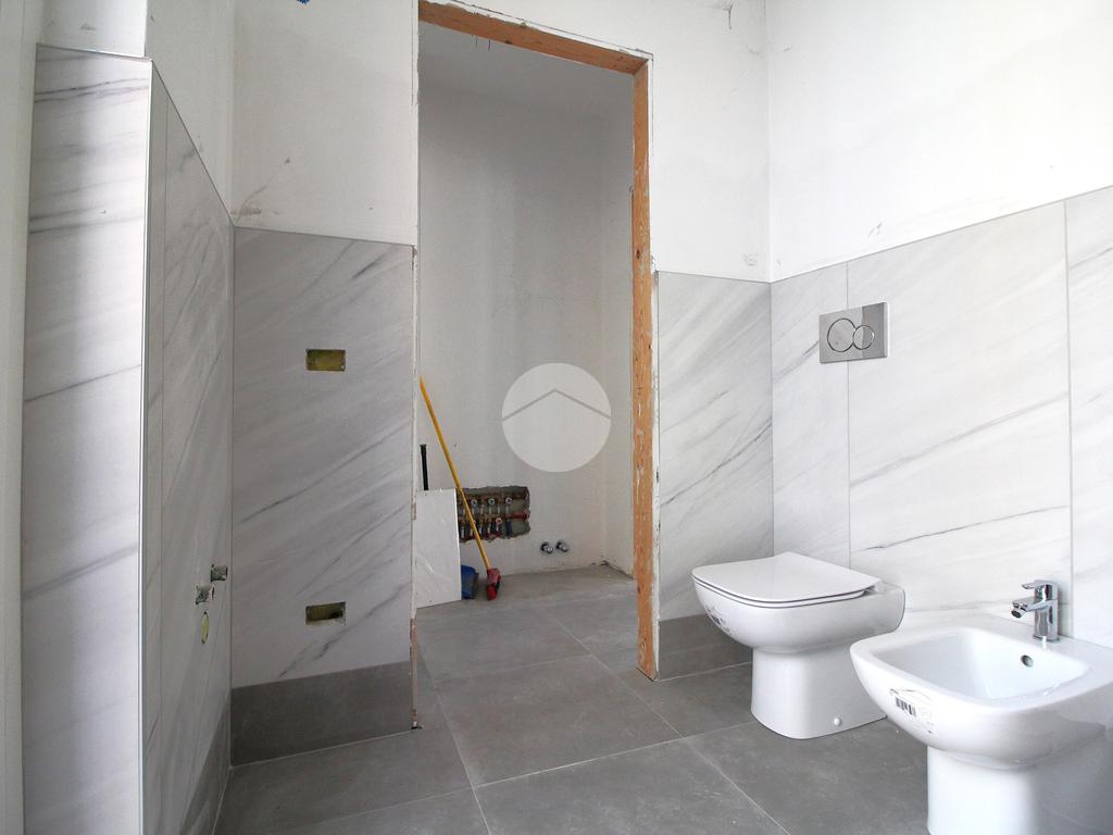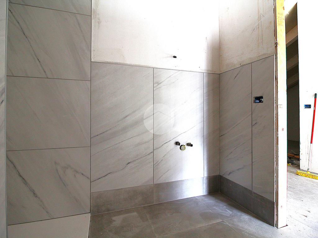 Il bagno è rivestito con piastrelle in gres porcellanato effetto marmo, ed è dotato di sanitari moderni filo muro e ampia doccia. Nell'antibagno è presente l'impianto di carico per la lavatrice.