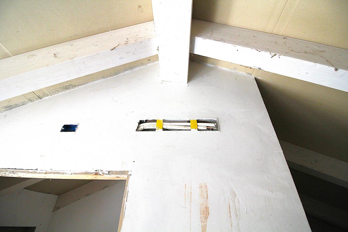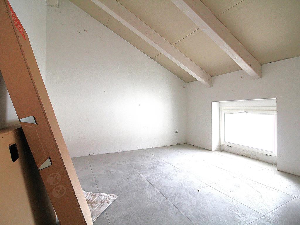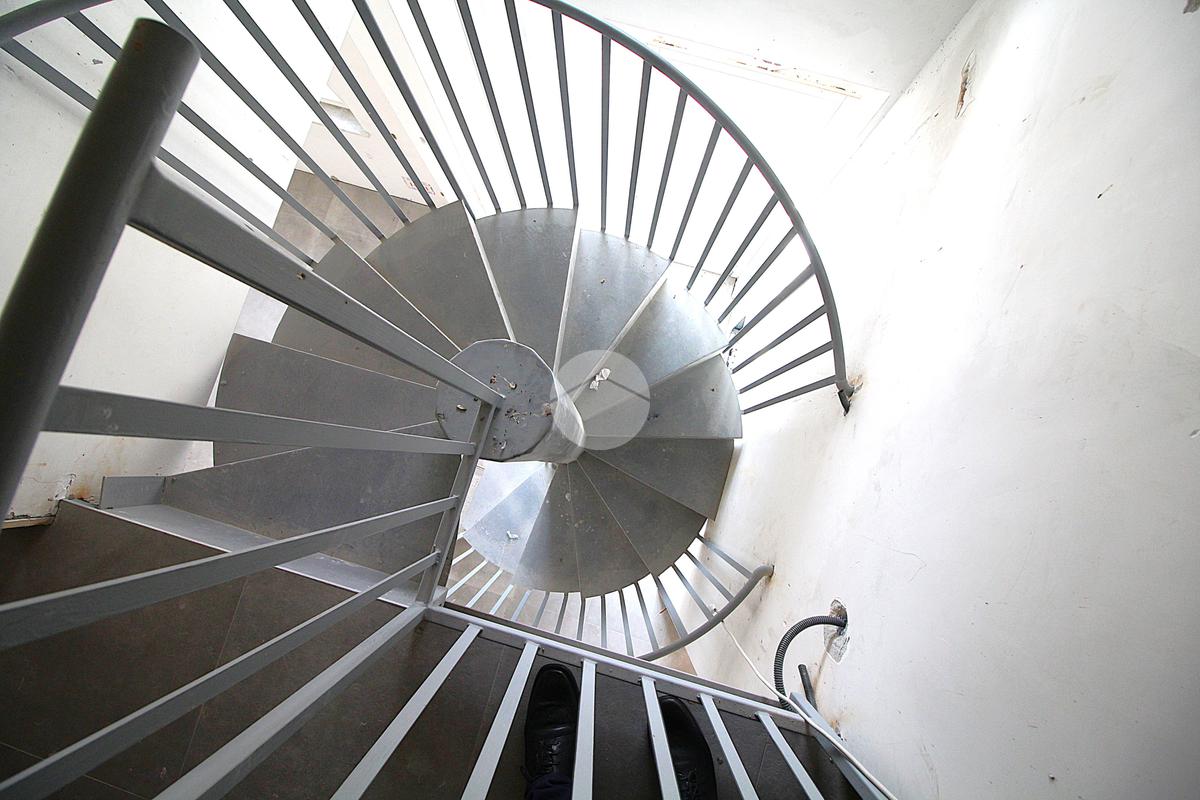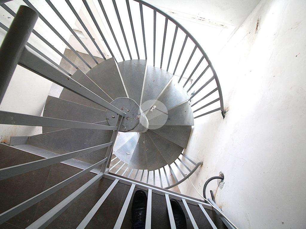 La scala interna realizzata con struttura elicoidale conduce al piano mansardato caratterizzato dal soffitto in legno a vista di colore bianco.