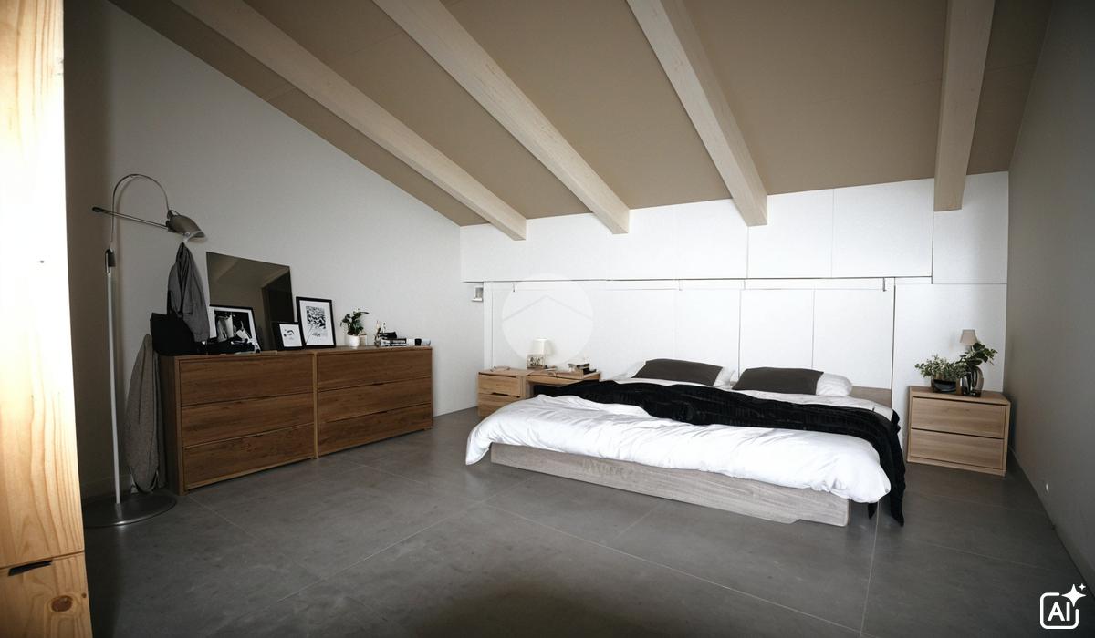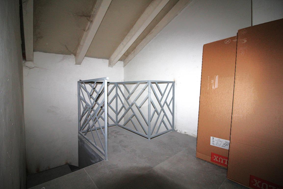 La scala interna conduce al piano mansardato caratterizzato dal soffitto in legno a vista di colore bianco.