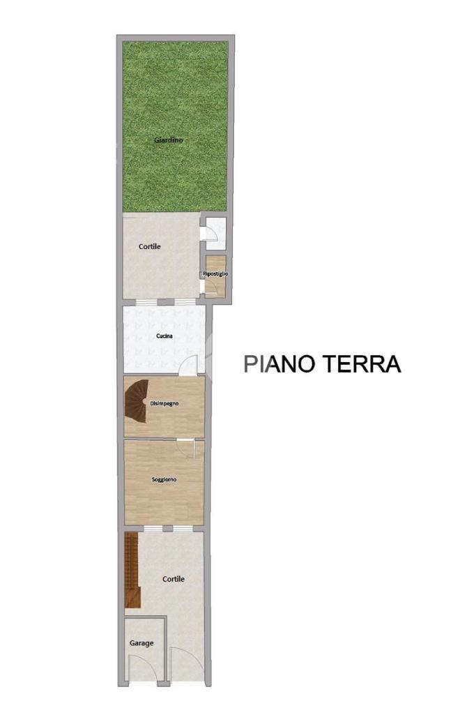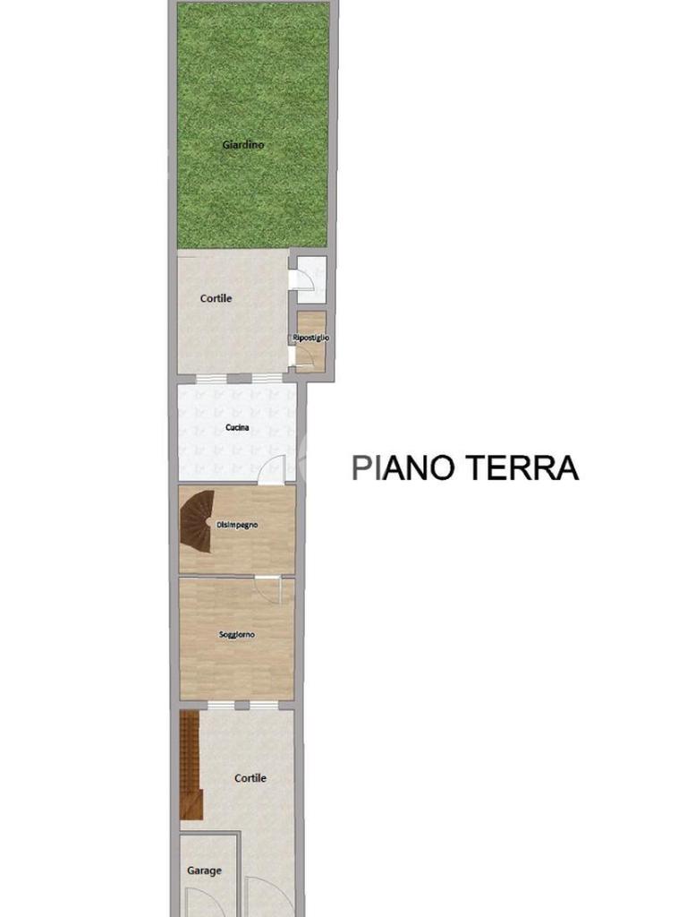 La seconda stanza è utilizzata come cucina abitabile, ed è illuminata da una finestra e dalla portafinestra che conduce al giardino; Il terreno si sviluppa per circa 100 mq. ed è presente un locale magazzino sfruttabile come ricovero attrezzi. Il locale caldaia è attiguo al magazzino.